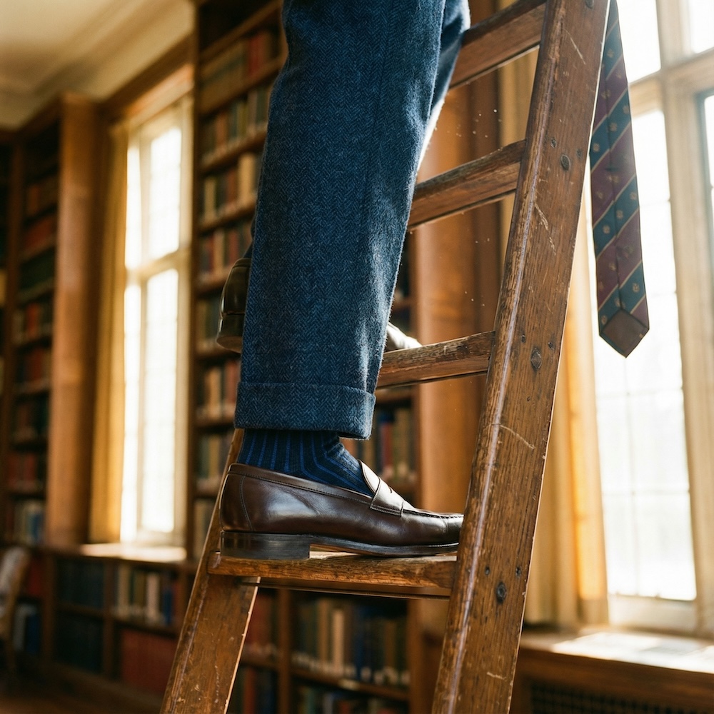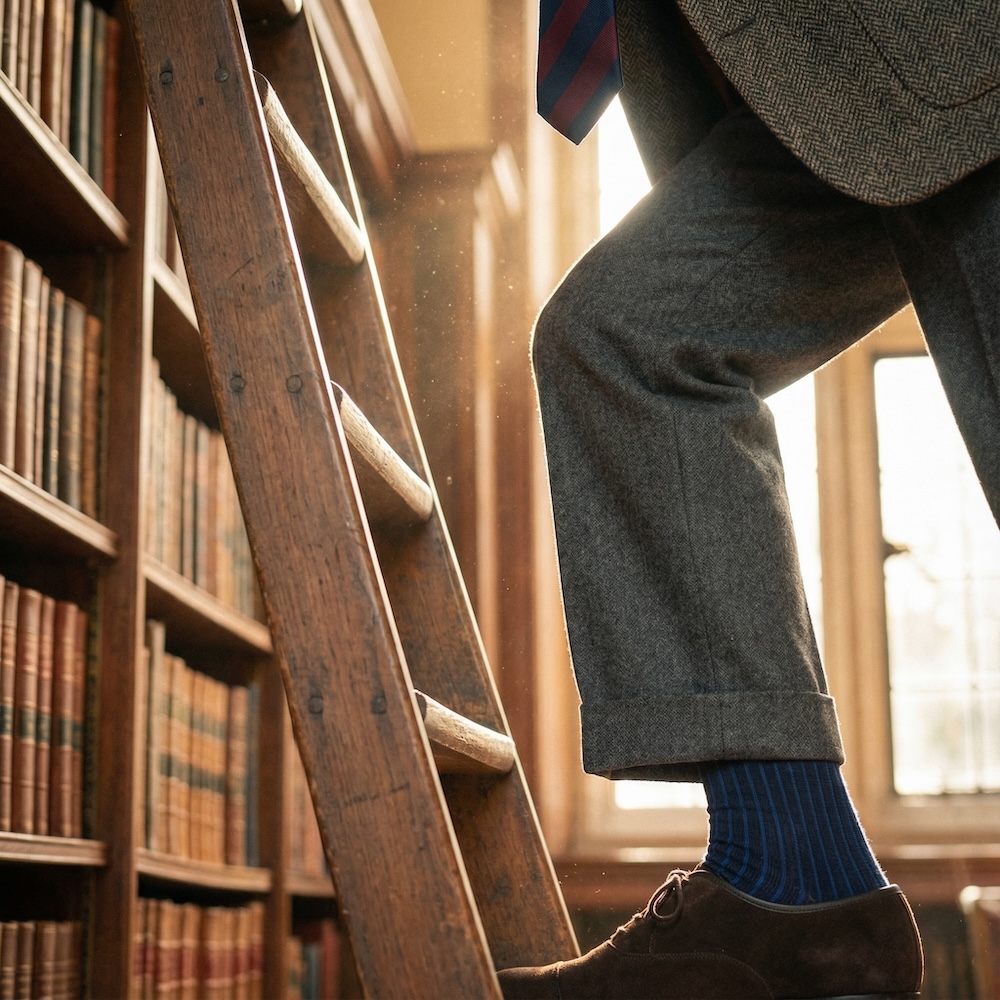 Le registre le plus formel. C’est le bleu qui disparaît dans le pli du pantalon, celui que l’on porte avec les costumes sombres, les derbies noires ou bordeaux, les journées d’audience ou de rendez-vous clients successifs.