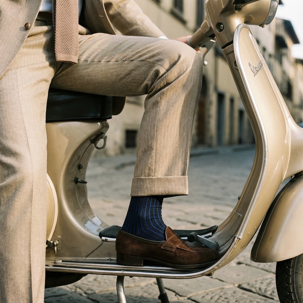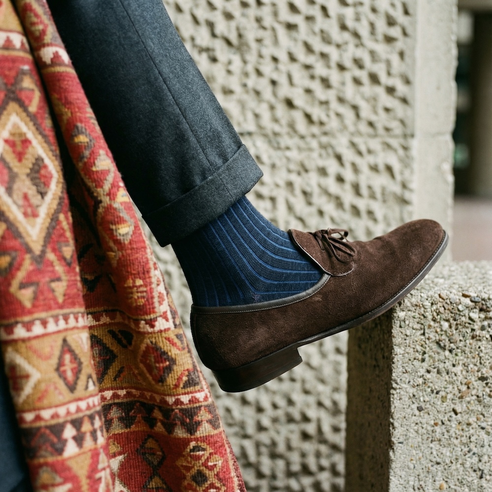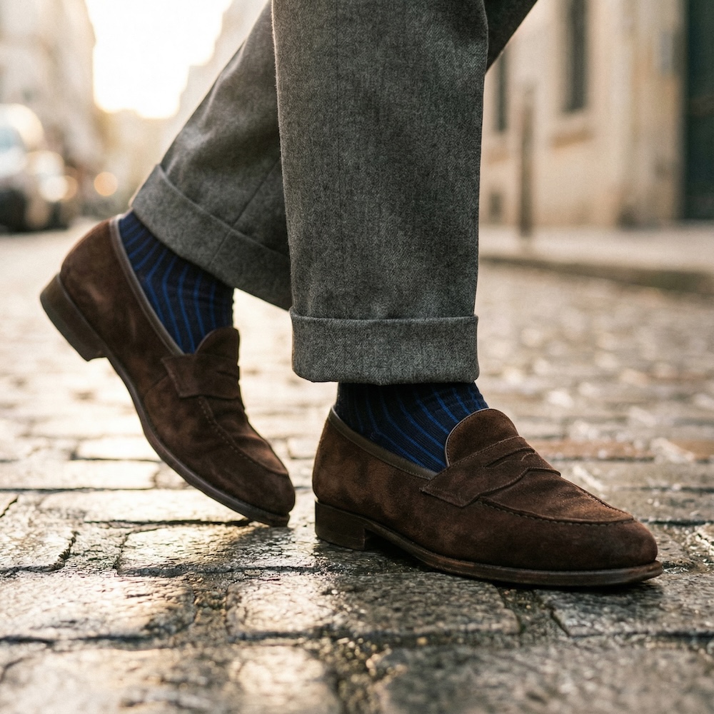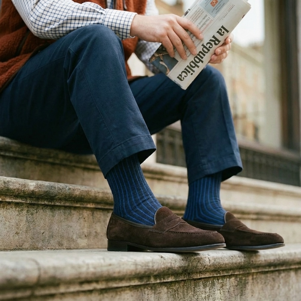 Un bleu légèrement plus vif, idéal pour sortir du sempiternel marine sans tomber dans la fantaisie gratuite. Avec un costume bleu moyen, un blazer croisé ou un chino beige, il apporte juste ce qu’il faut de relief à la cheville, surtout quand le reste de la tenue reste très sobre.