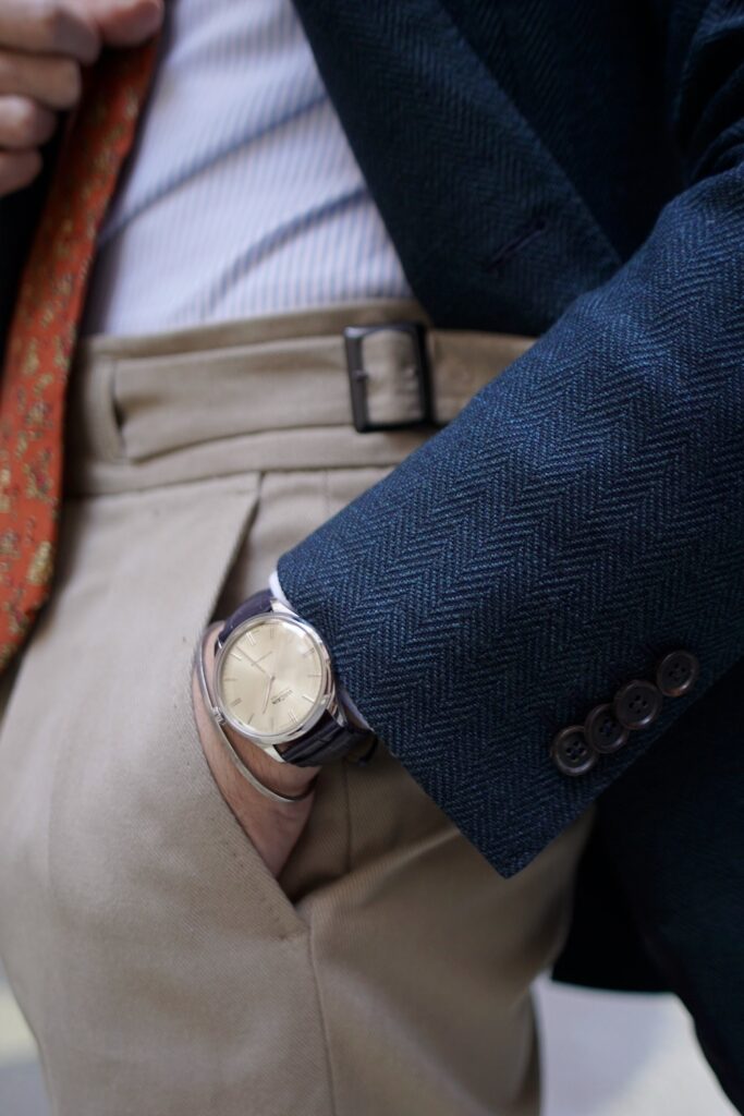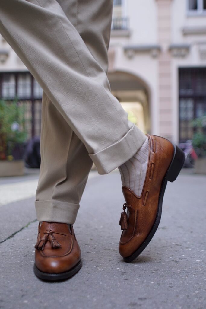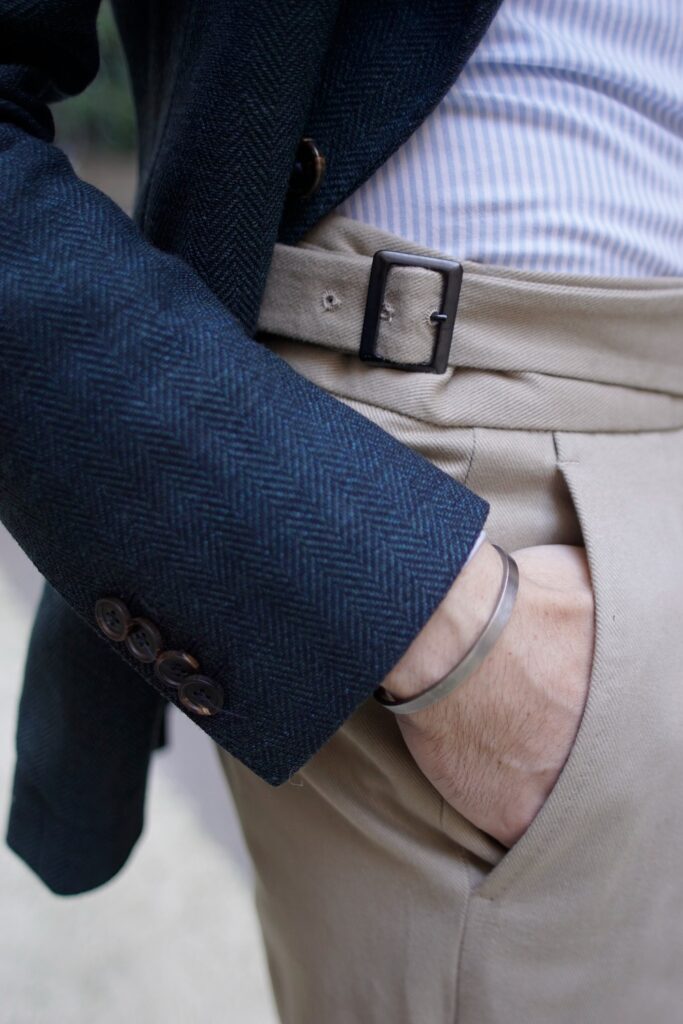 Cette tenue incarne l’élégance classique avec une touche de sprezzatura italienne. Le pantalon en twill de coton beige est la pièce clé qui apporte équilibre et polyvalence à l’ensemble. Sa coupe ample avec pinces et son revers bien marqué lui confèrent une allure à la fois raffinée et décontractée, parfaitement dans l’air du temps.