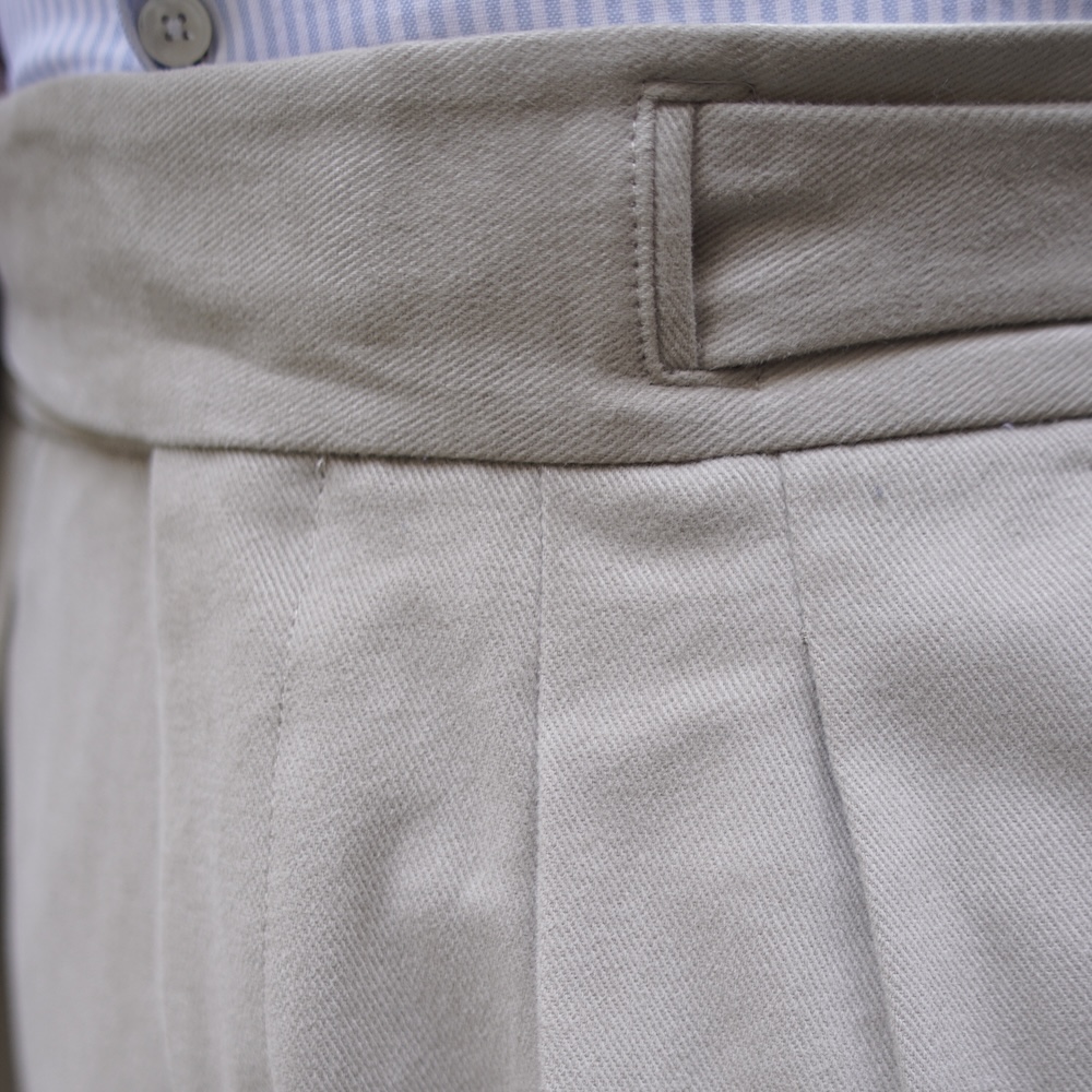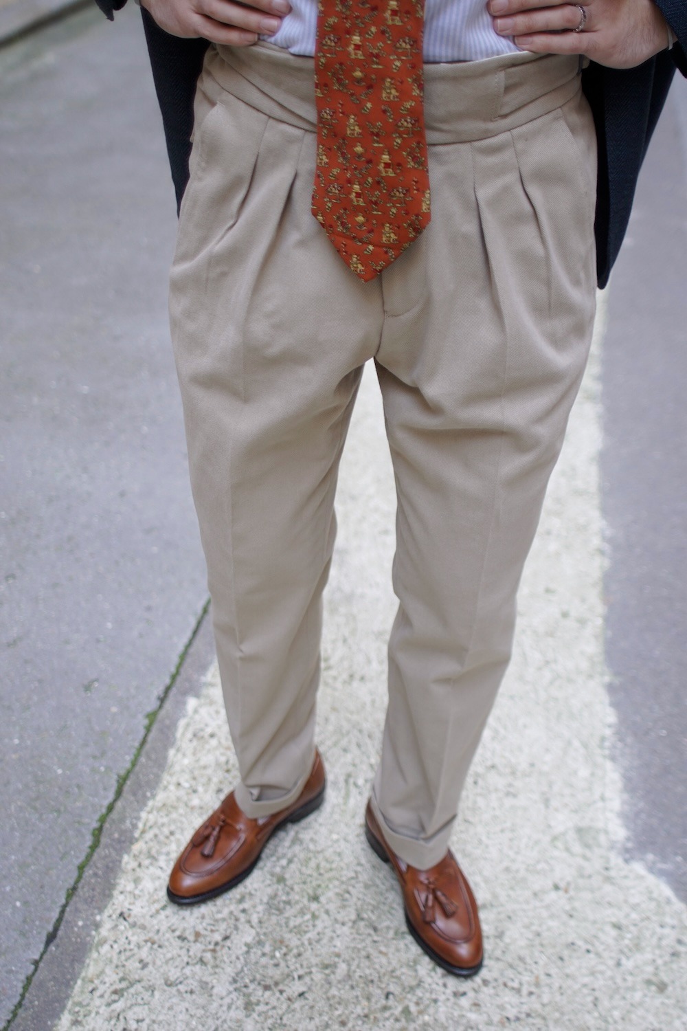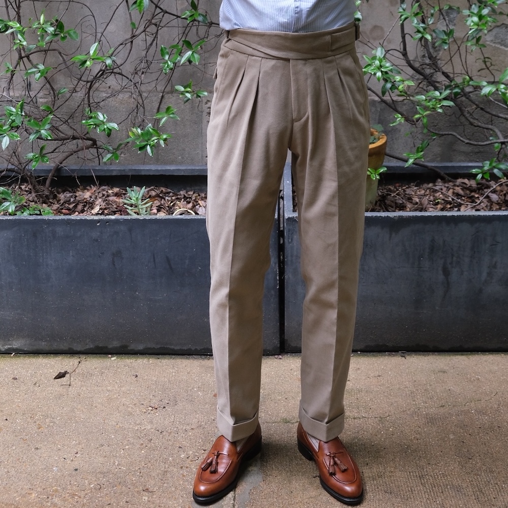 Le pantalon en twill de coton beige clair joue un rôle crucial dans l’équilibre de la tenue. Sa coupe ample avec pinces et son revers généreux lui confèrent une allure à la fois élégante et décontractée, créant un contraste subtil avec le côté plus rustique de la veste.