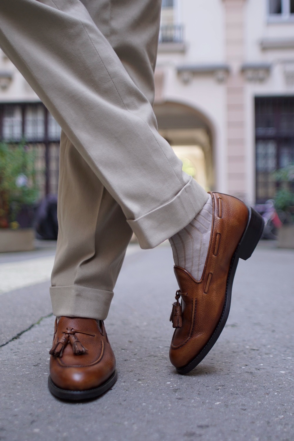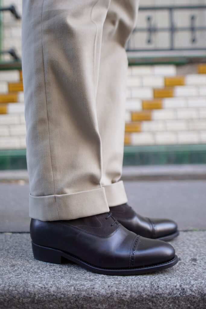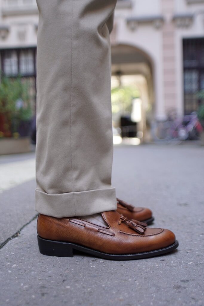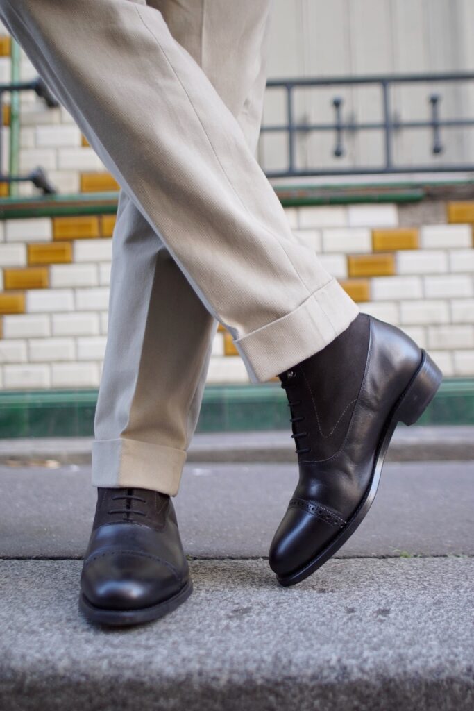 Cette coupe est plus indiquée si vous comptez porter votre gurkha avec un pli frontal marqué, dans des tenues plus habillées.