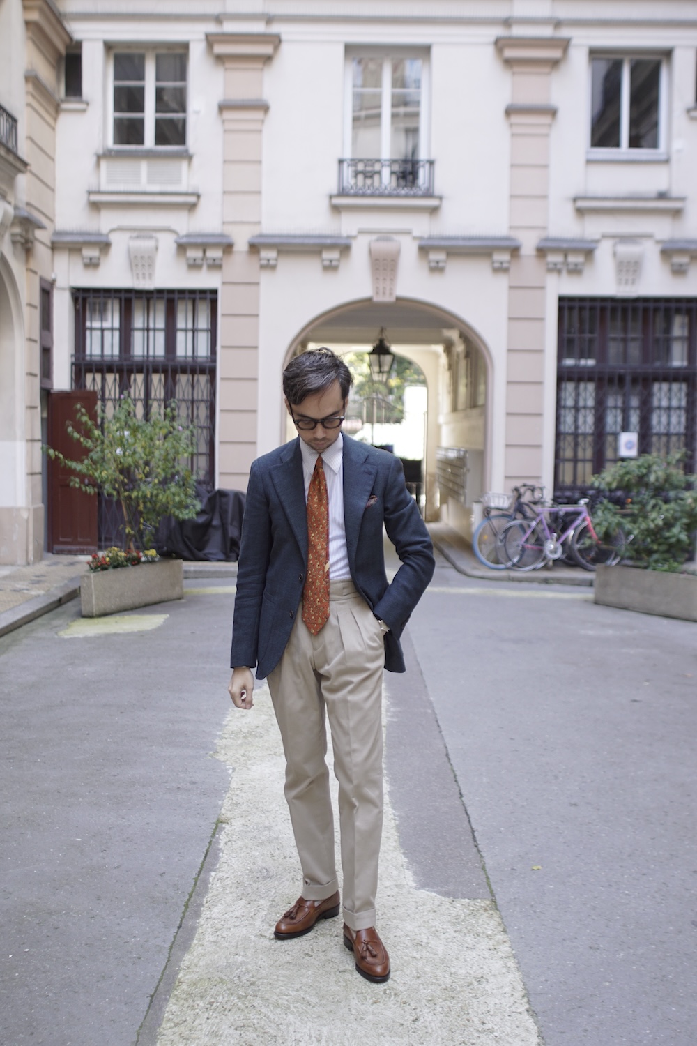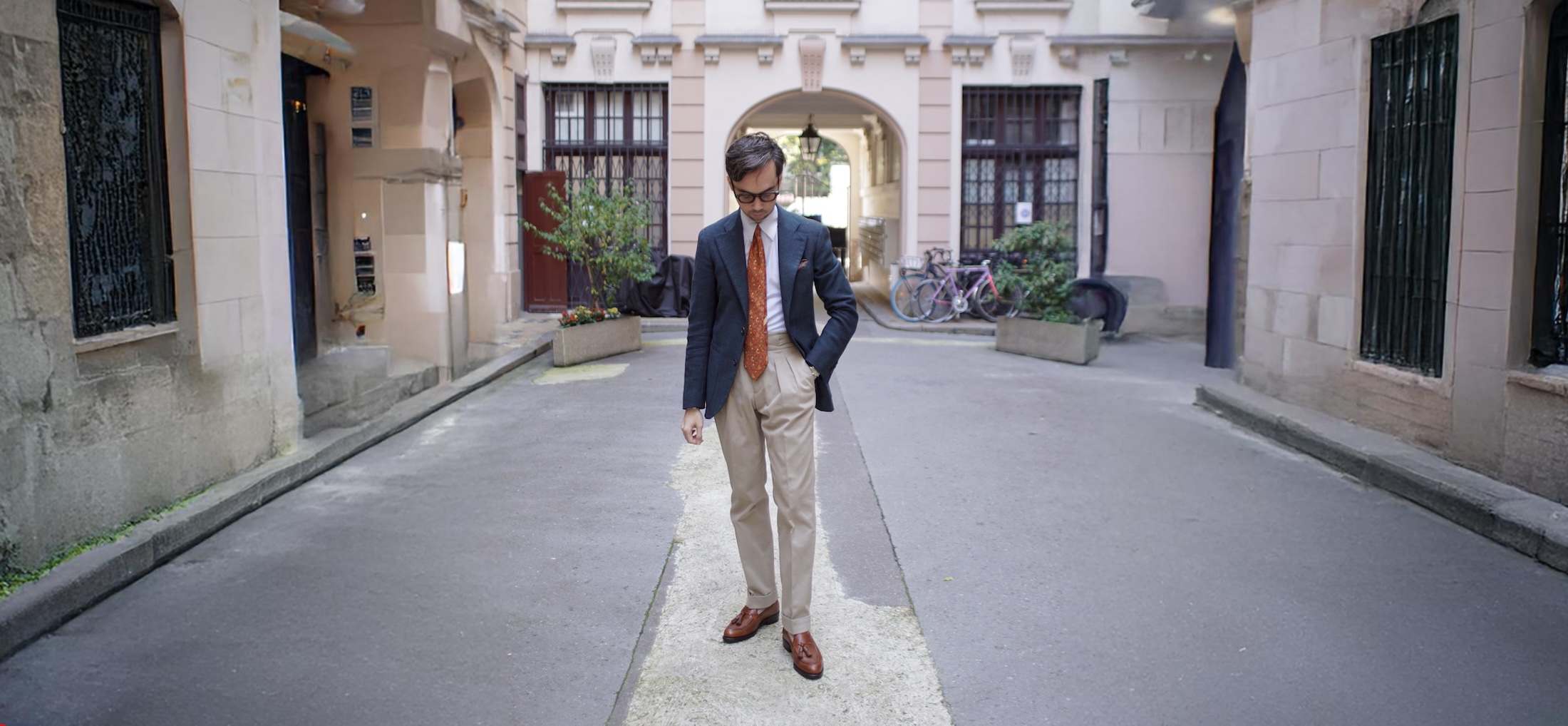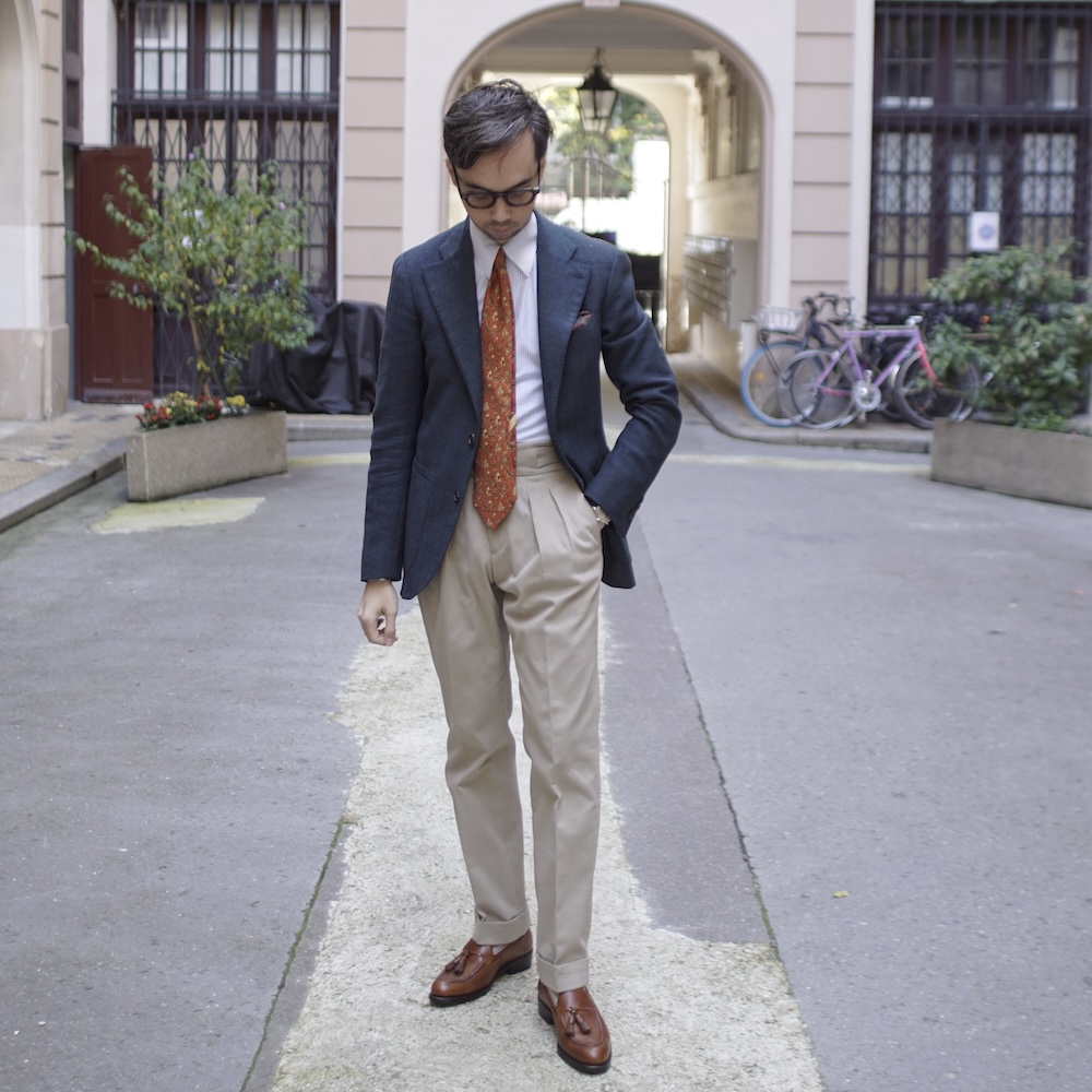Le blazer bleu marine structure la silhouette, tandis que la cravate orange apporte une touche de couleur audacieuse. Les mocassins à pampilles en cuir marron complètent harmonieusement l’ensemble, ajoutant une note de décontraction maîtrisée.