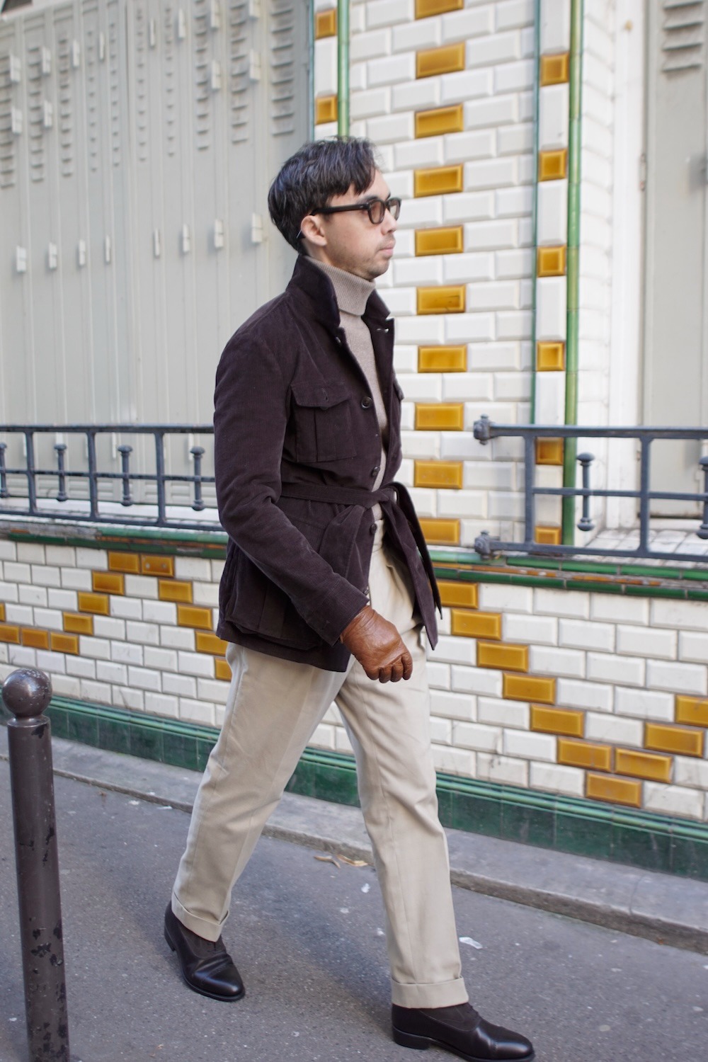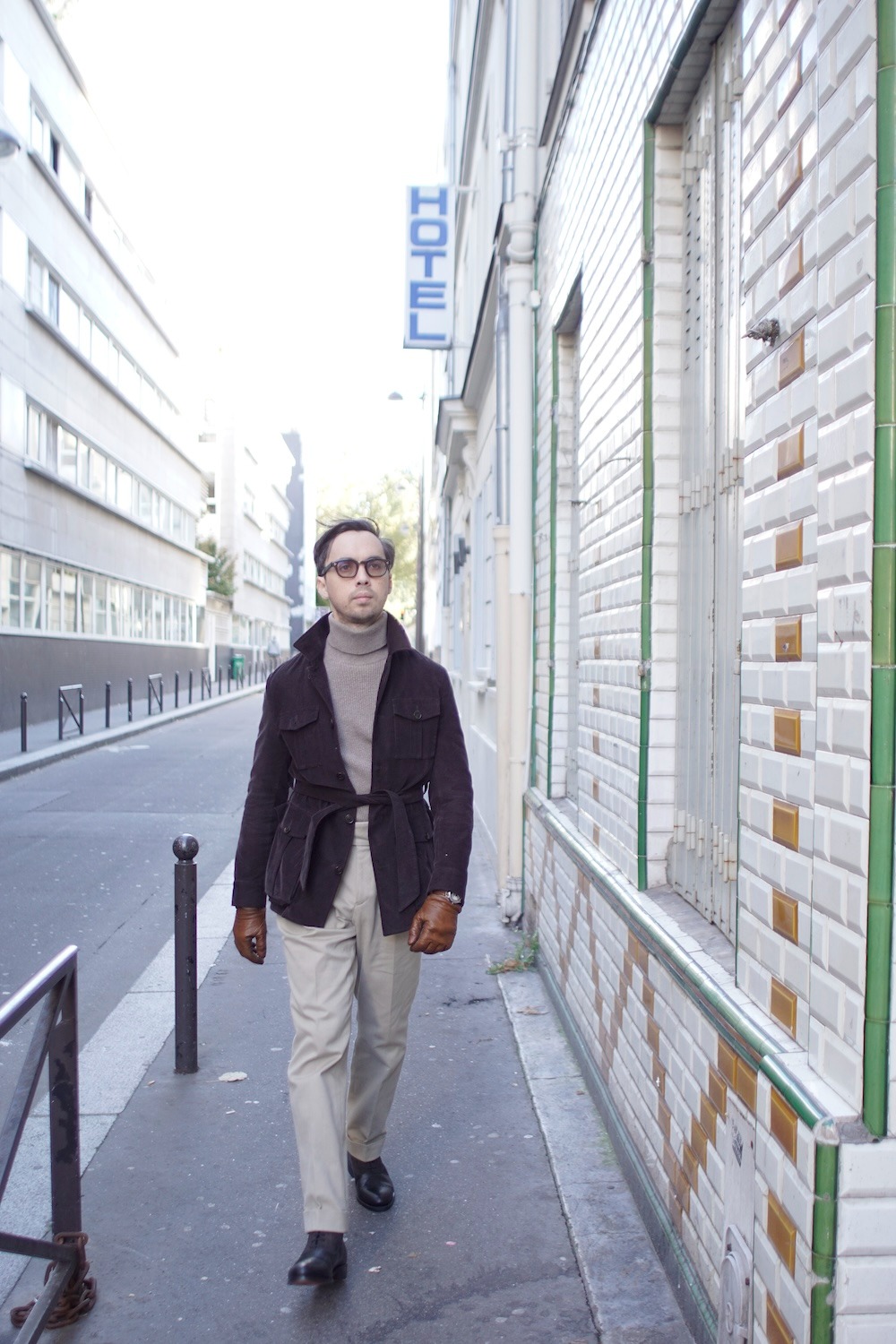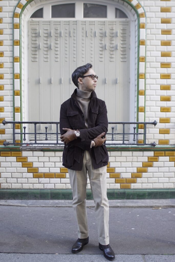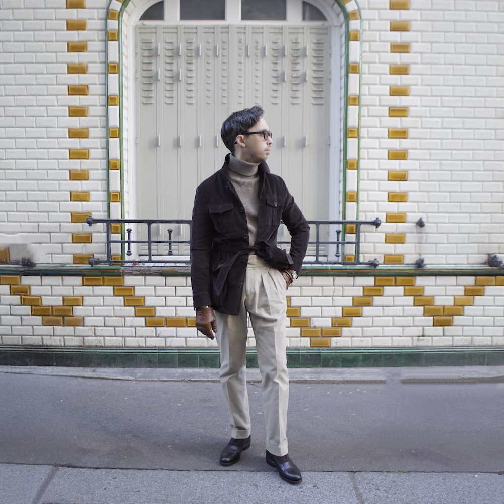 La pièce maîtresse de cet ensemble est sans conteste la safari jacket en velours côtelé noir, qui apporte une touche d’authenticité et de caractère. Son style utilitaire, hérité des expéditions coloniales, se marie ici admirablement avec des éléments plus urbains et raffinés.