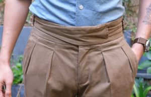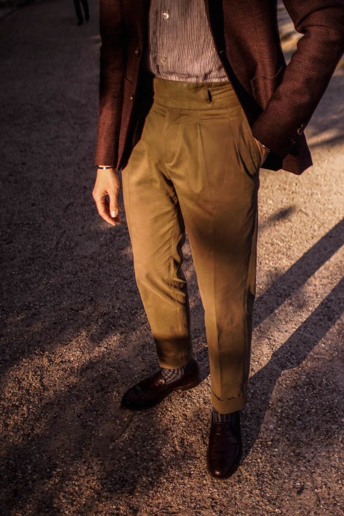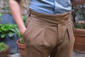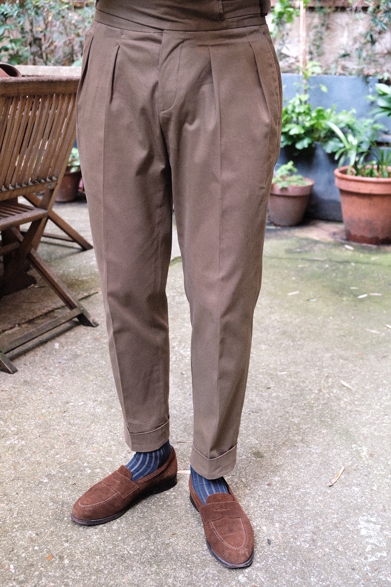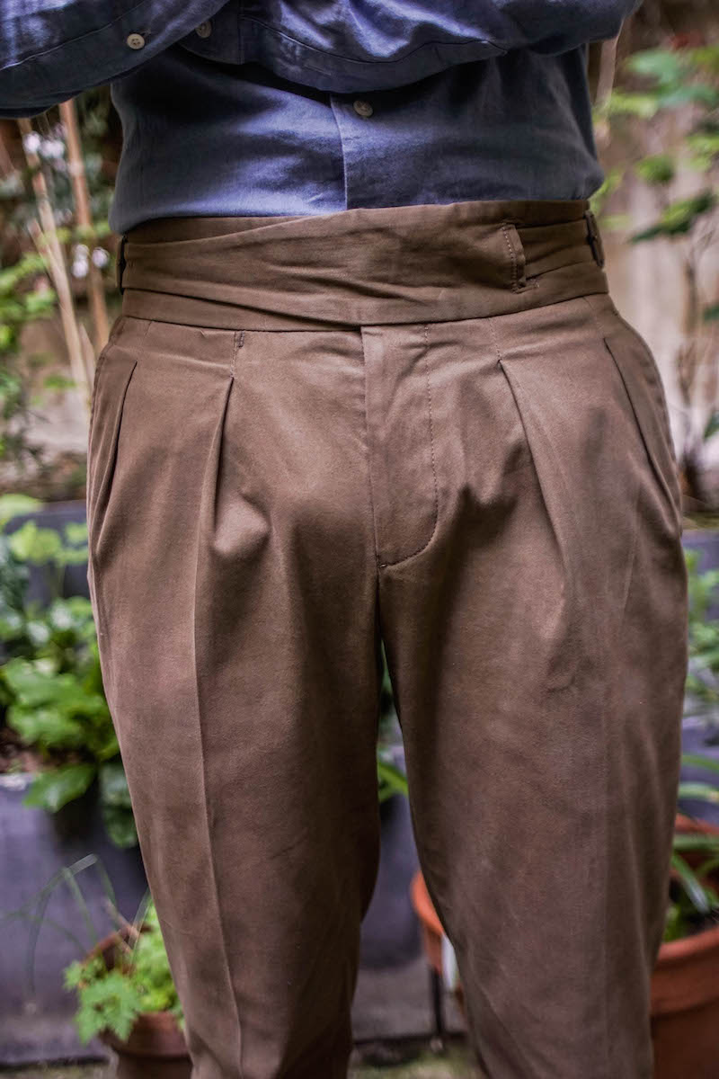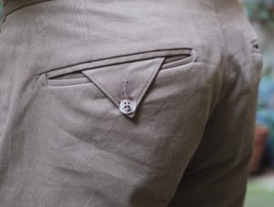 C’est ce qui fait toute la particularité de ce Gurkha: je vous ai déniché un coton Tessuti di Sondrio légèrement stretch avec 97% de coton et 3% d’élasthane pour le confort.Tessuti Di Sondrio est une filature de coton assez confidentielle fondée en 1895 et qui appartient à présent au groupe italien Marzotto: elle est à l’origine de la culture du coton en Valteline, dans les Alpes (un peu le Biella du coton, où les eaux sont assez pures pour le lavage, la teinture et la finition du coton)Elle a plus de 100 ans d’expérience dans le coton et est justement très appréciée pour son coton stretch, un coton résistant et durable mais avec un peu d’élasthane pour le confort.C’est justement la gamme que nous avons choisi pour le Gurkha, avec un poids très polyvalent de 270g: il s’agit d’un bon compromis pour garder un bon tombé sans étouffer en été (j’ai beaucoup porté ce chino au Cambodge, où j’étais à l’aise même à 35 degrés).On l’apprécie aussi pour la richesse de ses couleurs: entre un marron caramel au soleil et un khaki beaucoup plus sobre par temps couvert.