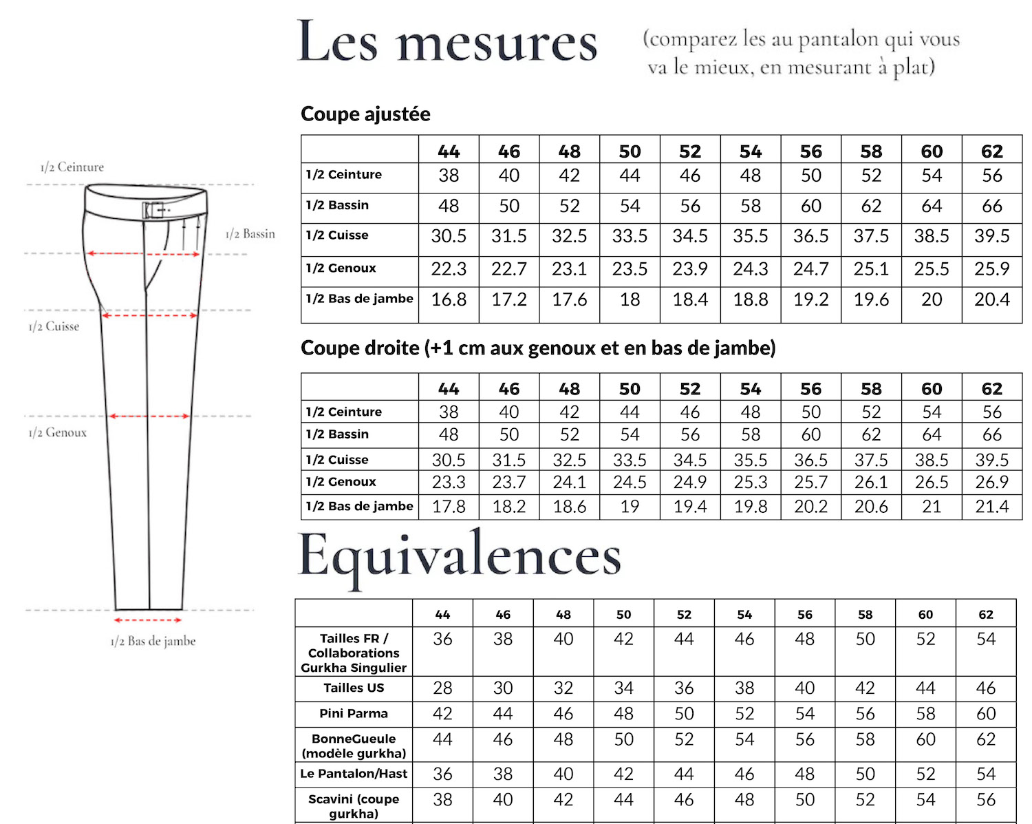 (si vous avez déjà commandé notre Gurkha en flanelle en 2021, vous pouvez simplement vous référer aux tailles FR du tableau d’équivalence, les mesures sont les mêmes)