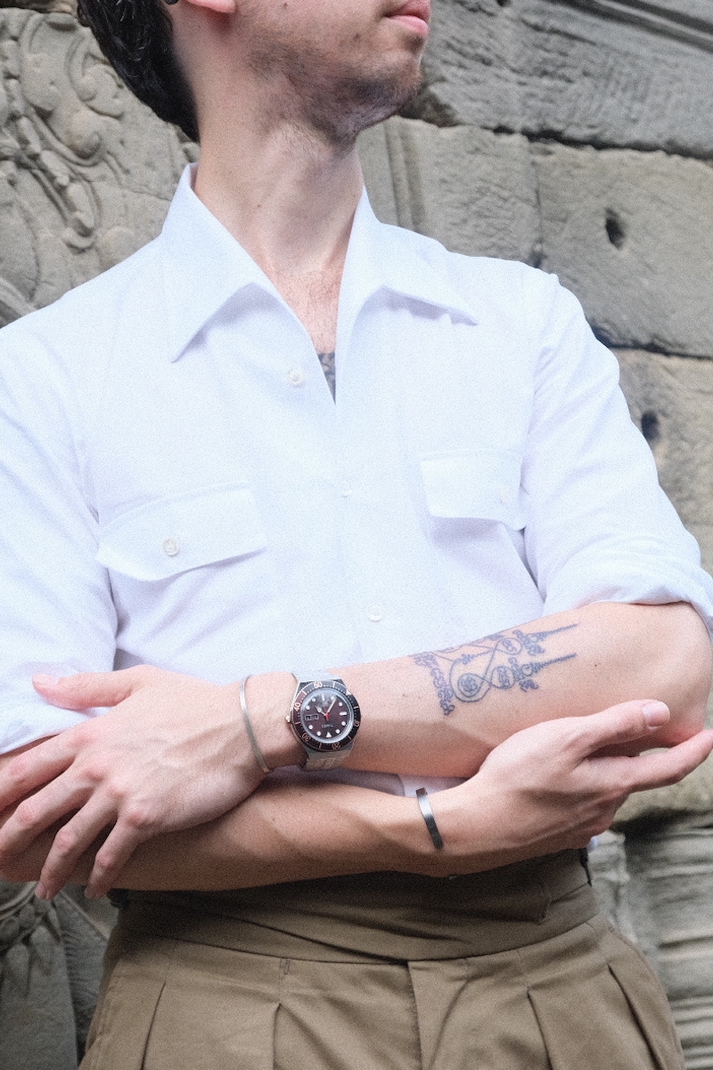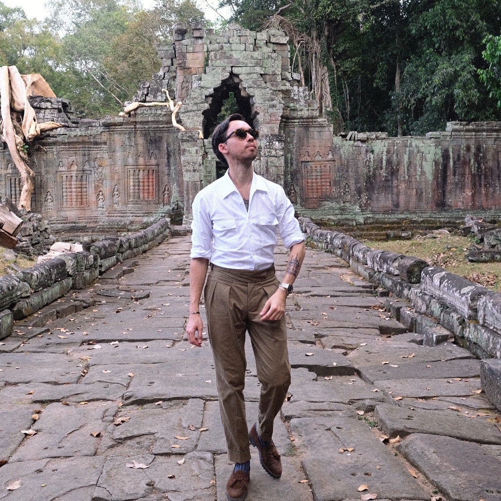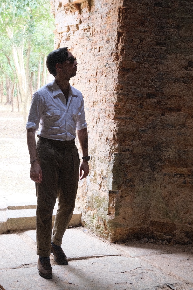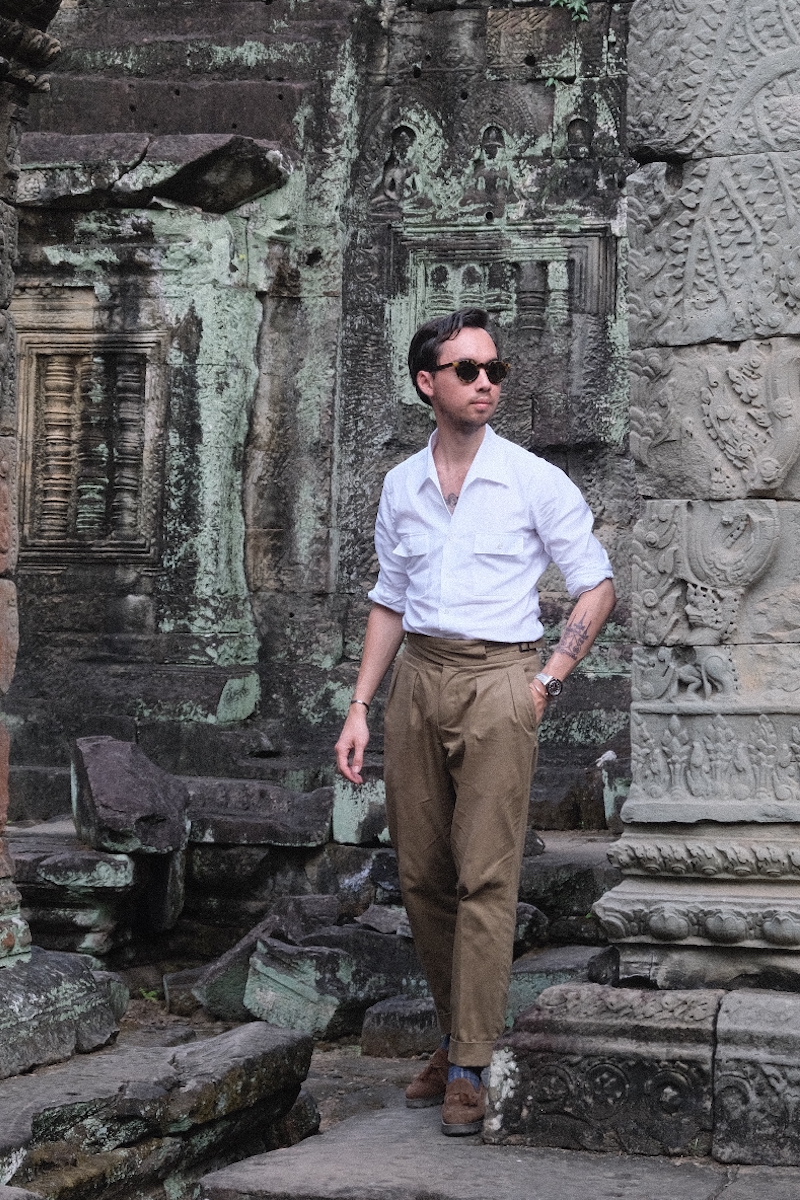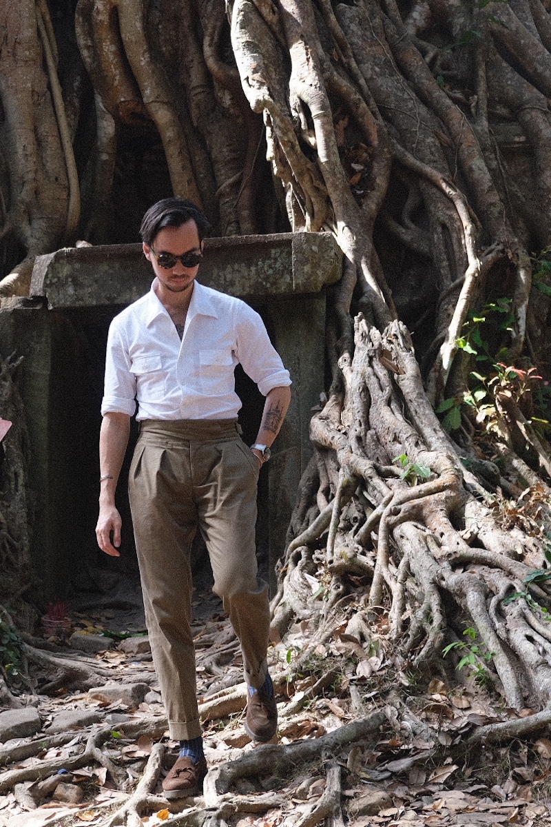 Sans non plus me prendre pour Indiana Jones, je voulais donner un petit côté explorateur à une tenue sartorial d’été classique.Ca passe par:- les deux poches poitrine sur une chemise blanche minimaliste col une pièce: bref, c’est ce qu’on appelle une safari shirt (elle vient de chez Clotilde Ranno)- évidemment le ceinturage gurkha- et la semelle commando sur les tassel loafers Vadillo de chez Septième LargeurBref, une tenue estivale qui a du caractère, mais qu’on pourrait évidemment porter sans problèmes en pleine ville