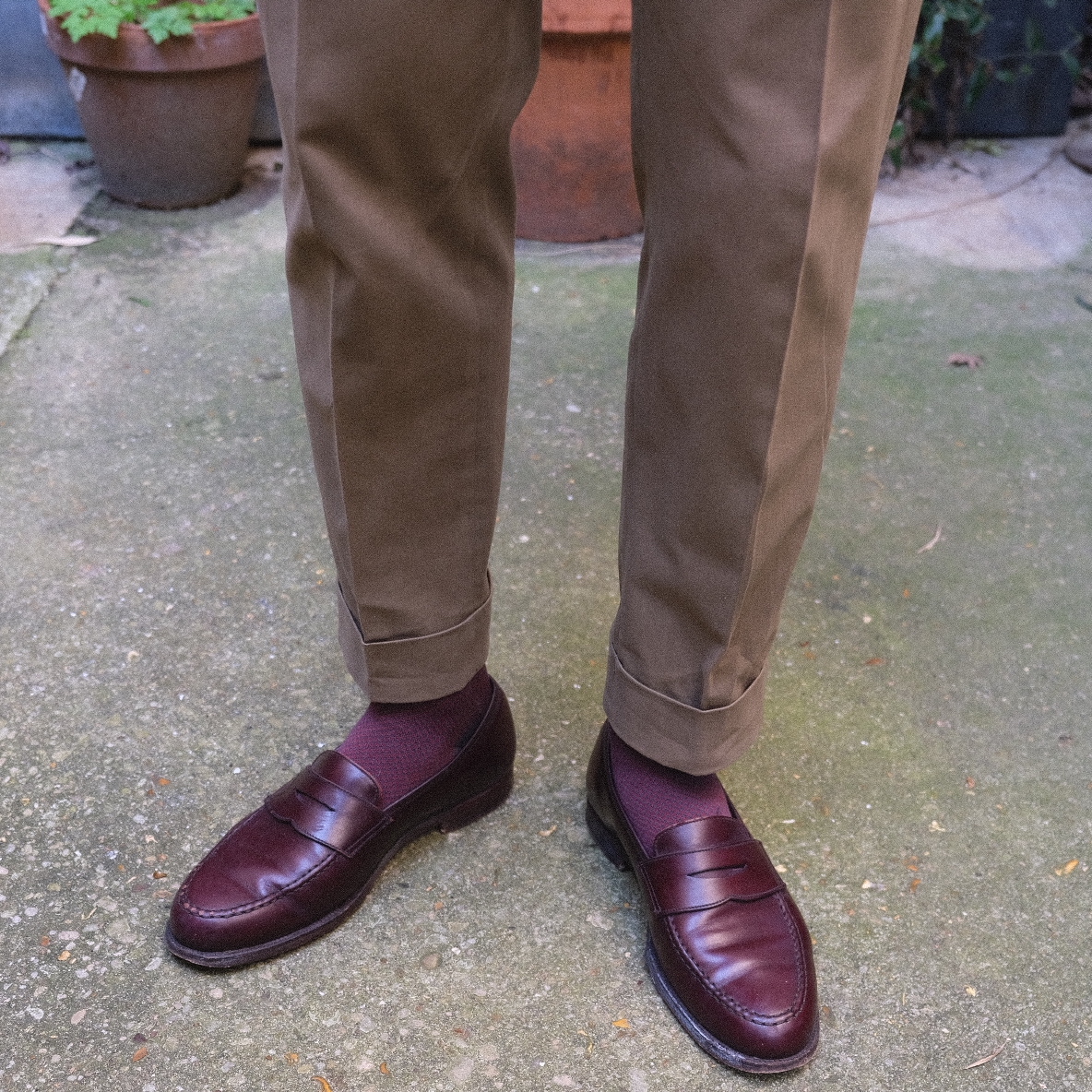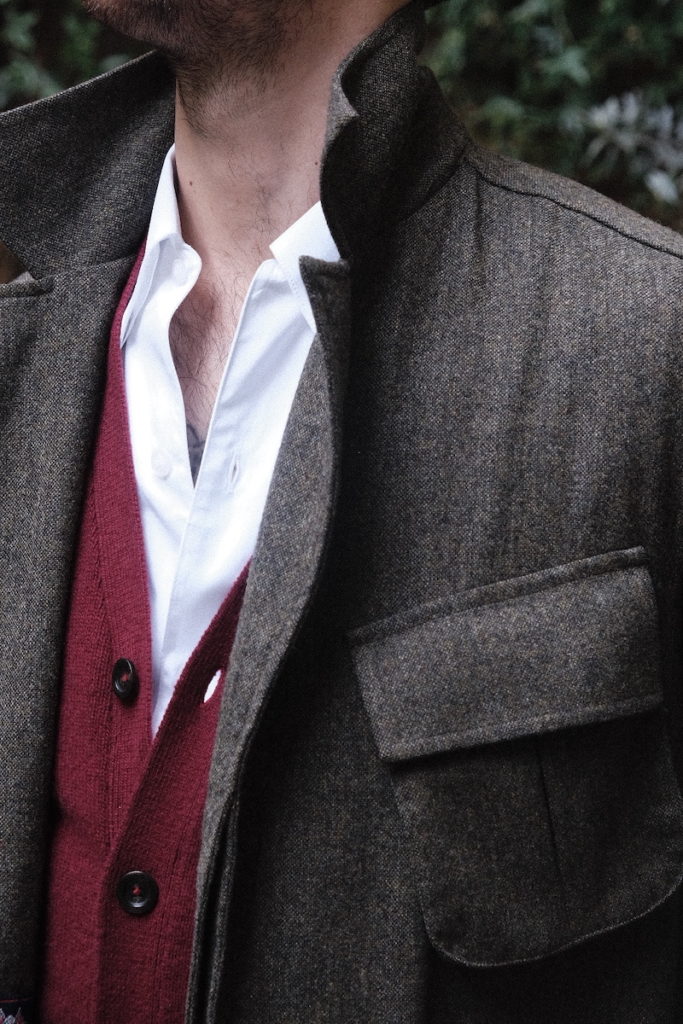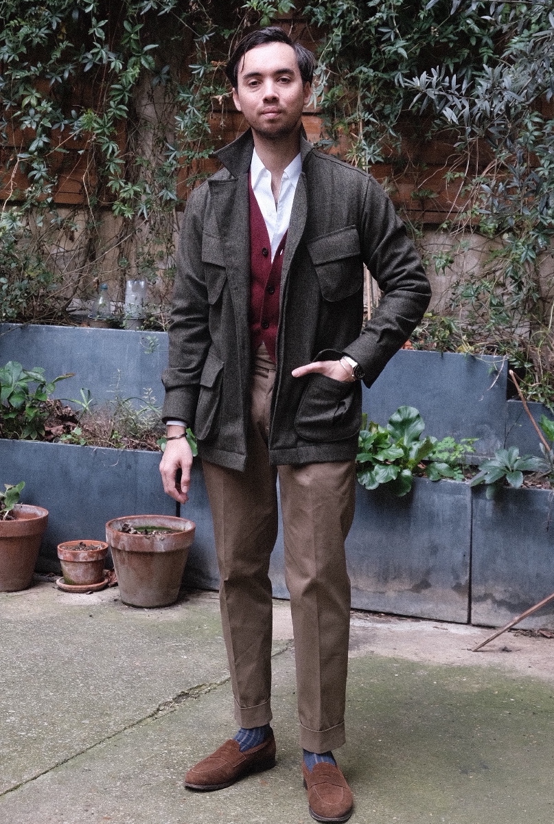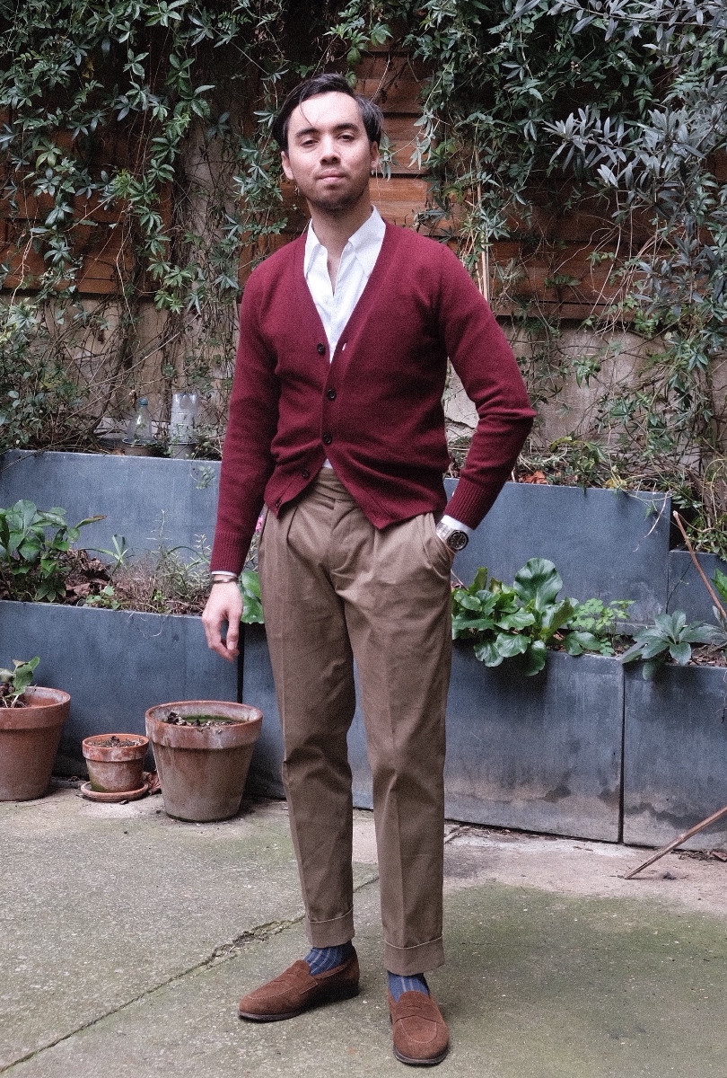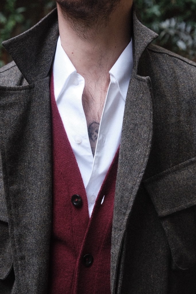 Voici ici une version mi-saison et plus urbaine de la première tenue:- la Jungle Jacket Yeossal fait bien echo à l’héritage militaire du Gurkha, sa laine est en plus assez fine pour se porter dans une tenue de mi-saison pour des journées à 10-15 degrés- le cardigan bordeaux de notre collaboration avec Paris-Yorker donne un côté plus habillé grâce à un coloris vif et noble- la chemise col une pièce en popeline de coton Hast est aussi habillée, même si le col une pièce donne du caractère- enfin, pour cette tenue plus citadine, j’ai opté pour des mocassins classique bordeaux en cuir lisse