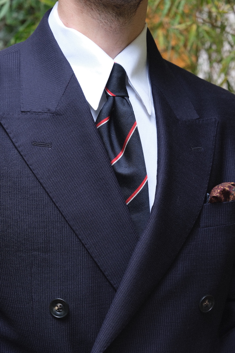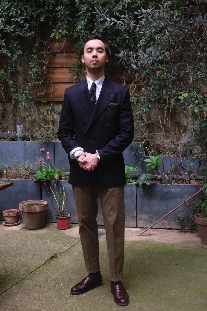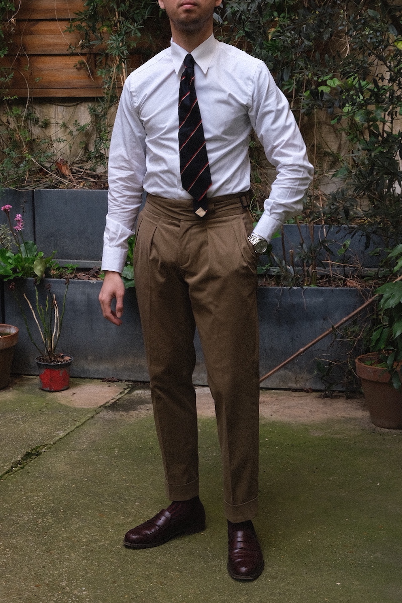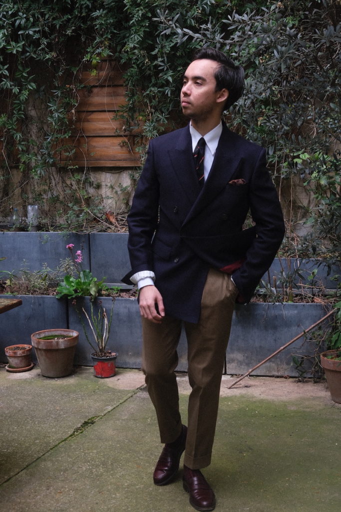 La tenue Ivy la plus classique du monde avec le fameux combo cravate régimentale + blazer croisé bleu marine.Ici, le gurkha vient simplement remplacer le pantalon beige classique, avec une nuance de couleur un peu plus originale.Pour ce genre de tenue plus habillée, j’ai une préférence pour la coupe droite qui permet un tombé plus propre et un pli avant plus marqué.