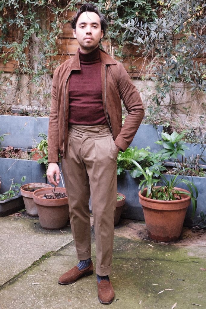 Pratiquement une tenue de week-end ici qui s’appuie sur des variations de marron entre le blouson en cuir de chèvre, le gurkha et les penny loafers.Seule petite erreur: j’aurai pu rajouter un peu de contraste à la tenue en optant pour un pull col roulé bleu marine plutôt que bordeaux.
