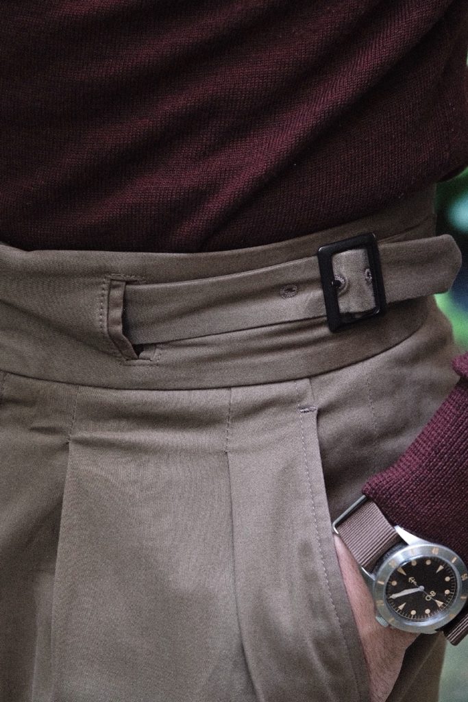 Le vrai double ceinturage des pantalons gurkas, pour une taille adaptable et un port facile aussi bien par dessus une chemise fine qu’une maille un peu épaisse.