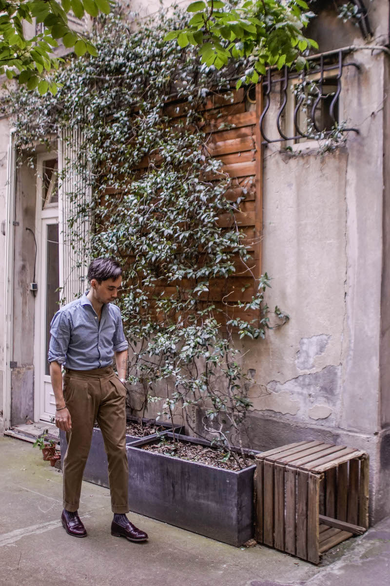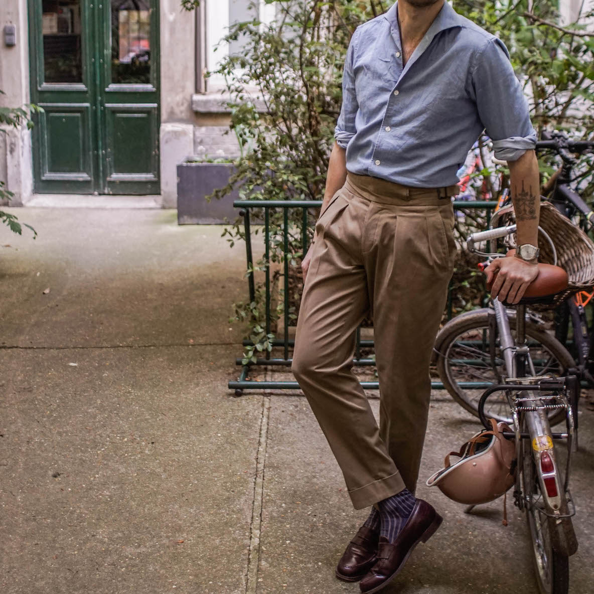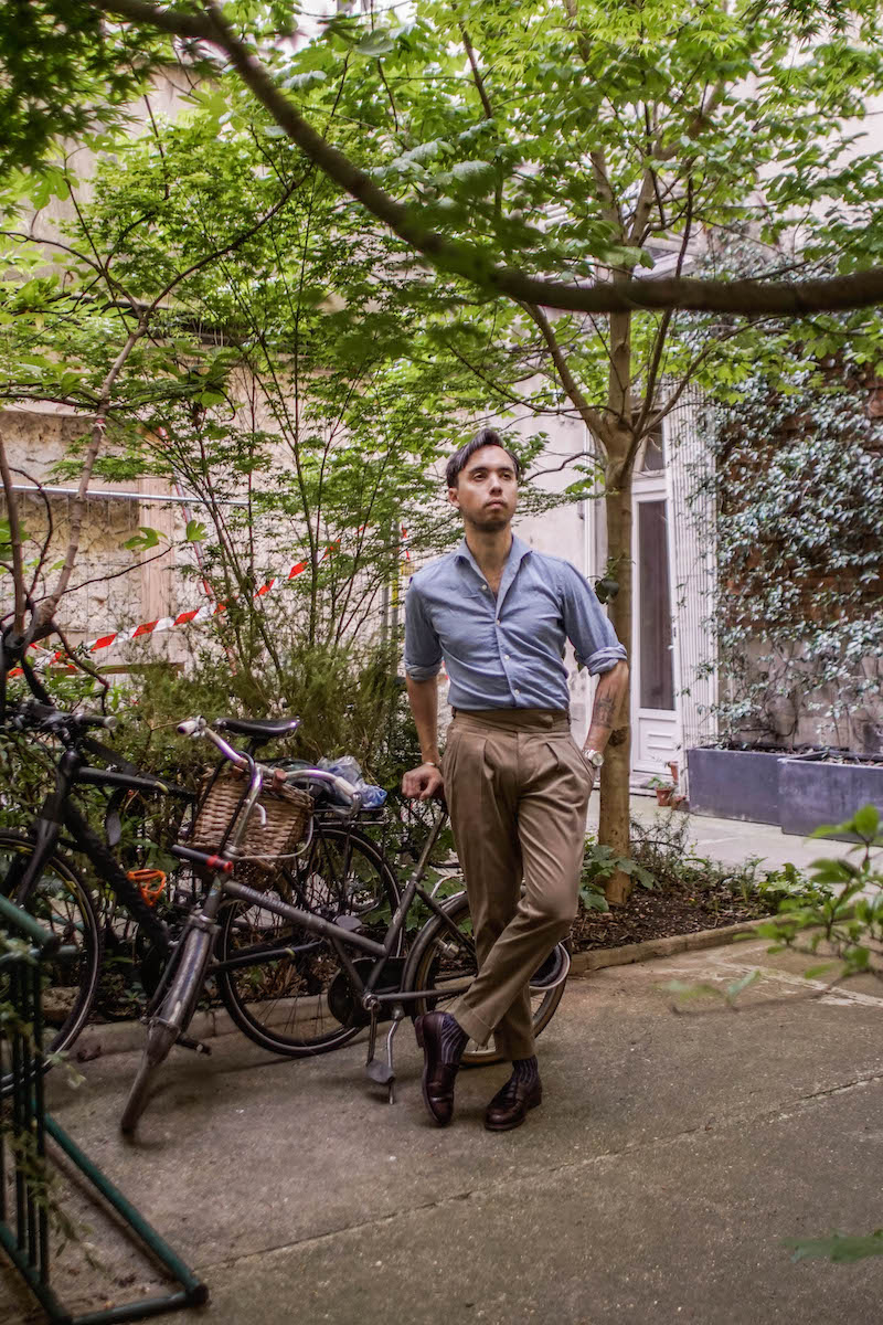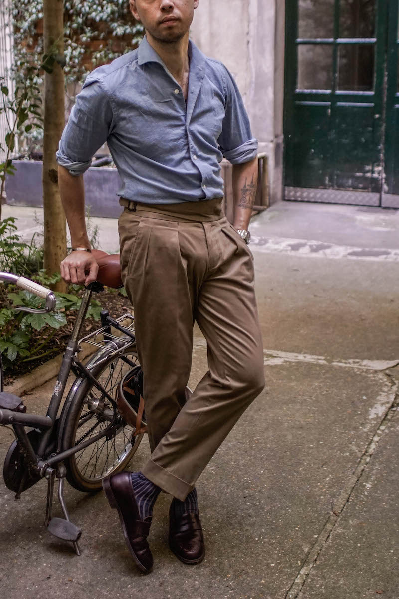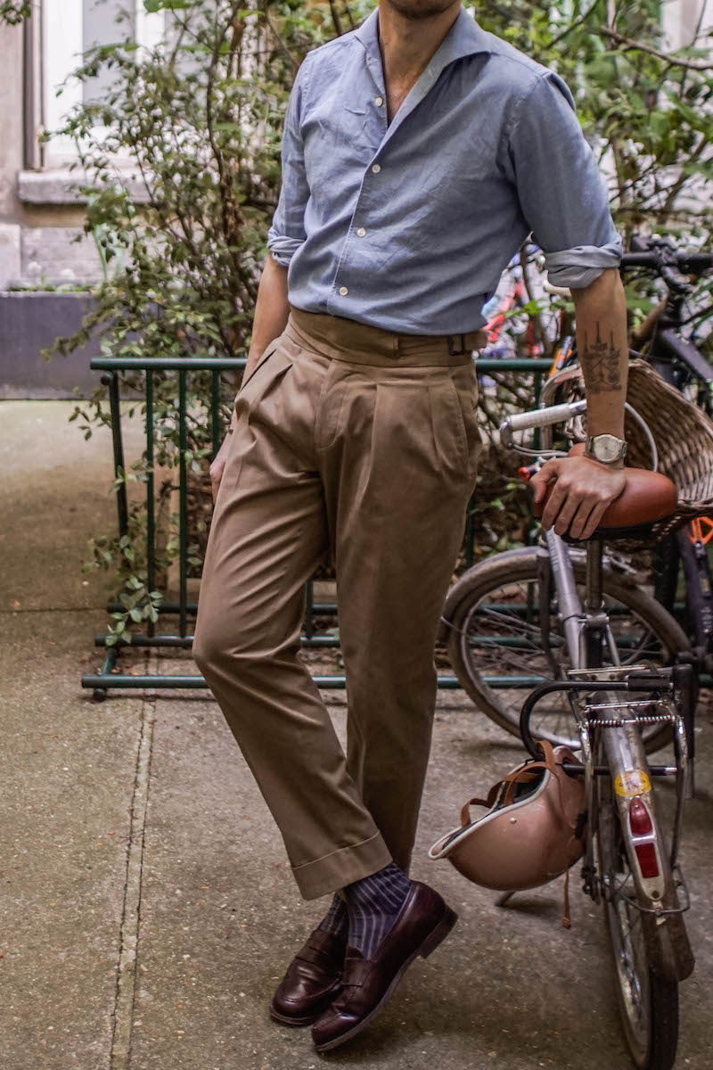 Il s’agit d’une version beaucoup plus ordinaire de la tenue explorateur, avec des pièces plus caractéristiques de la villeCa passe par:- une chemise col une pièce denim qui reste original par son col mais dont le tissu contraste bien avec le gurkha en termes de matière et de couleur- évidemment le ceinturage gurkha- des mocassins bordeaux en cuir lisse qui rajoutent un côté un peu habillé