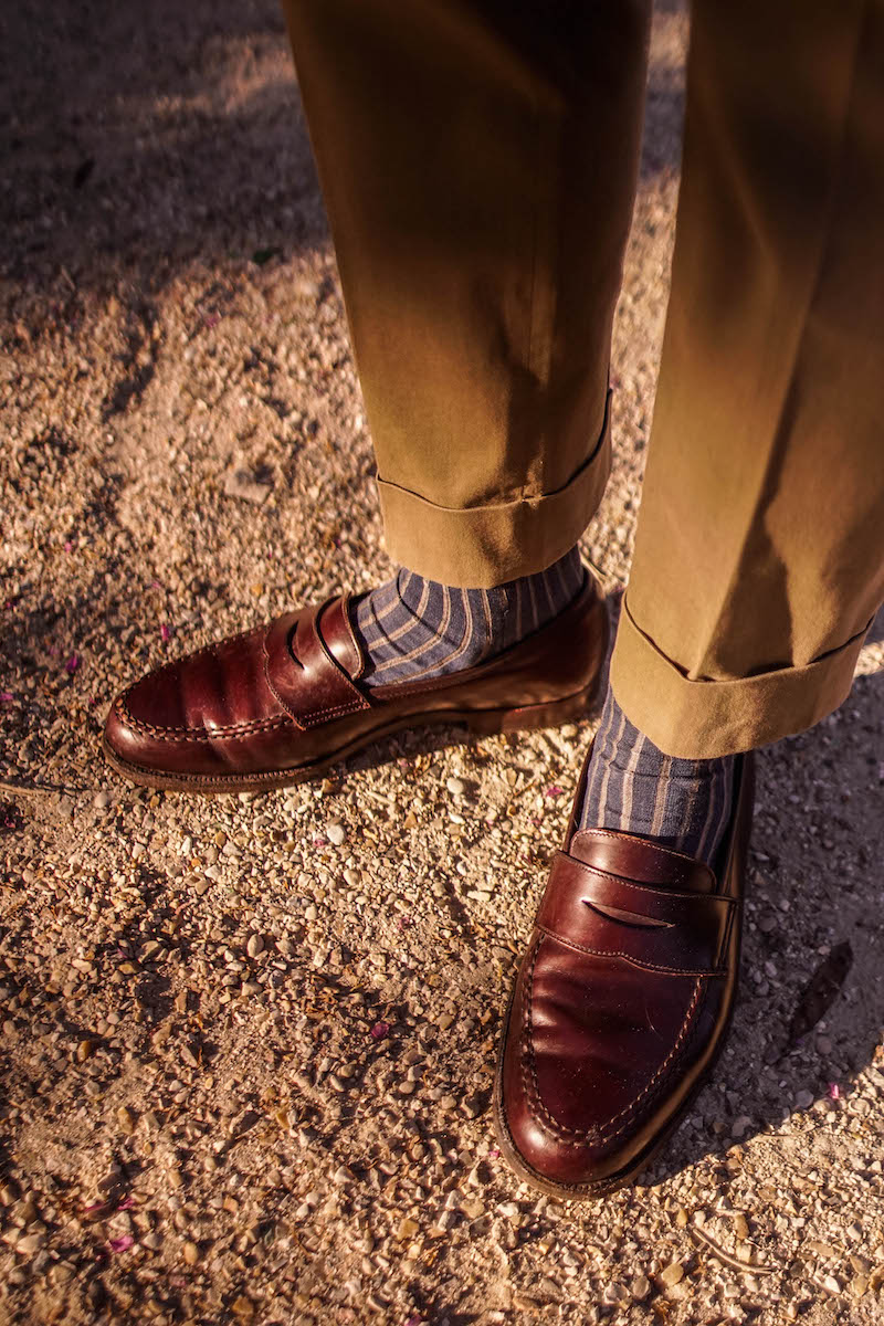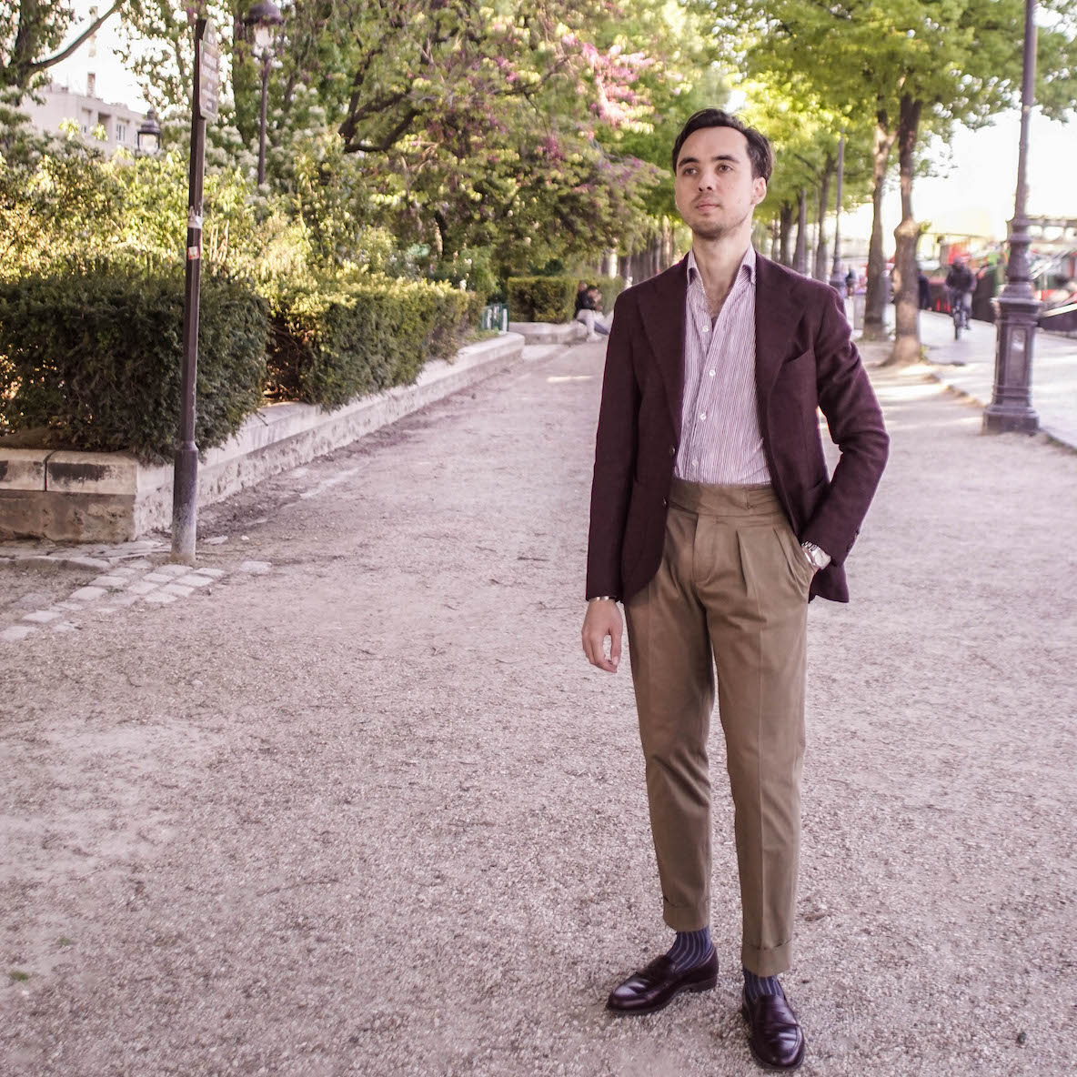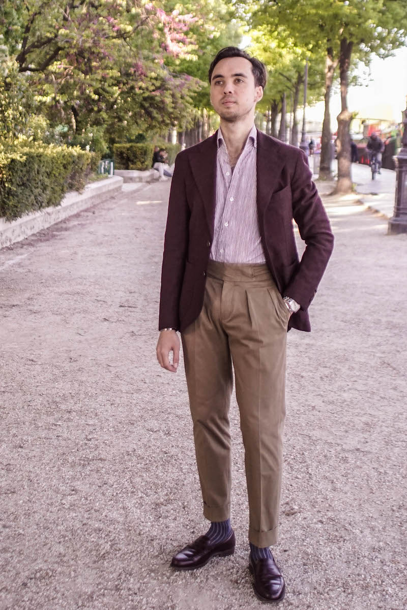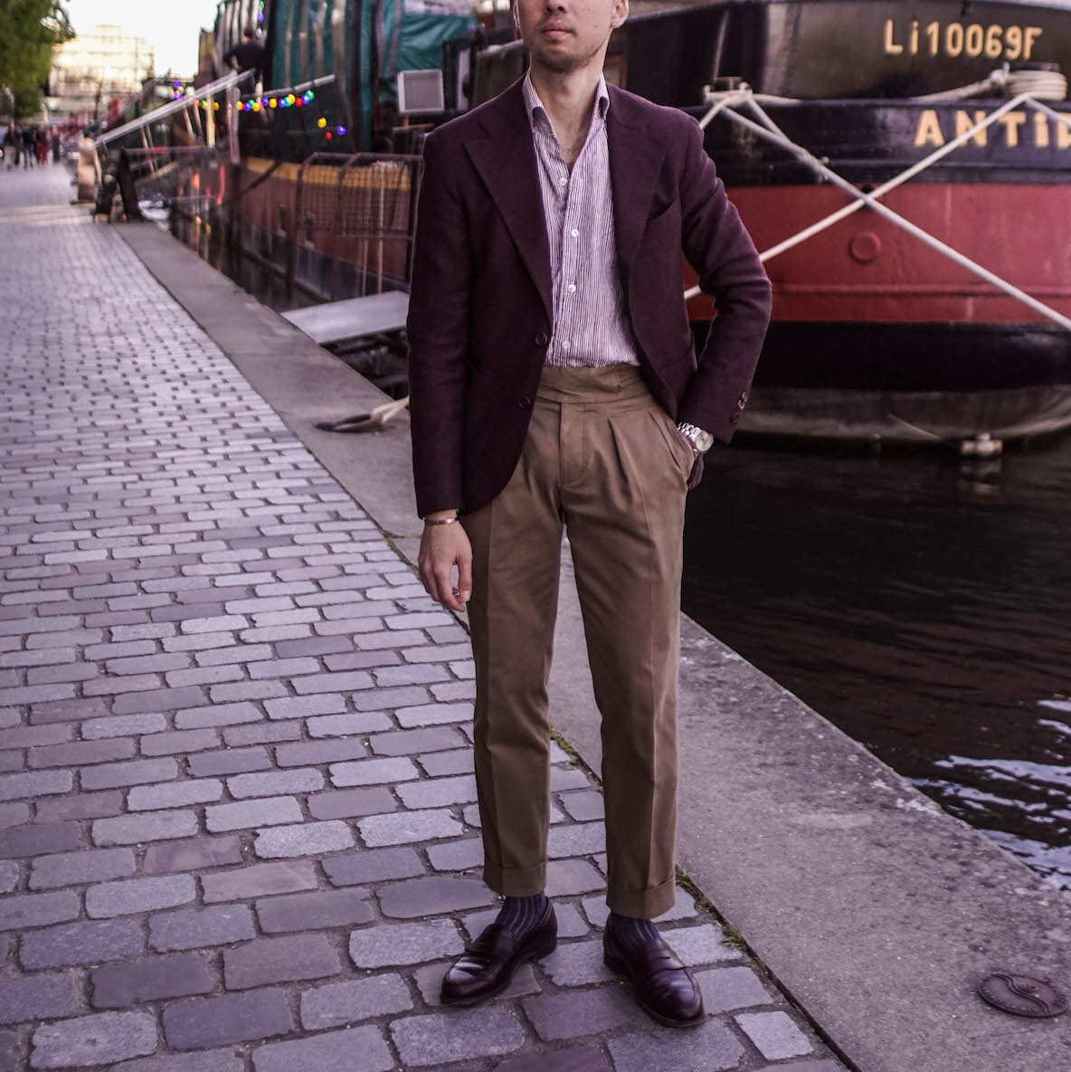 Voici ici une tenue casual chic plus estivale- la veste bordeaux rend l’ensemble très habillé et se démarque par le roulé prononcé du revers- la chemise col une pièce apporte également une finition plus originale: il s’agit ici de coton seersucker, ce qui donne un aspect plus casual à la tenue qui colle bien avec le côté décontracté du Gurkha.- enfin, pour cette tenue plus citadine, j’ai opté pour des mocassins classique bordeaux en cuir lisse qui rappellent subtilement la veste et les rayures de la chemise, sans en faire trop